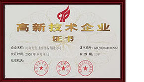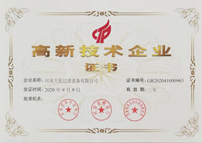 2020年9月9日——河南大張過濾設(shè)備有限公司榮獲“高新技術(shù)企業(yè)”證書